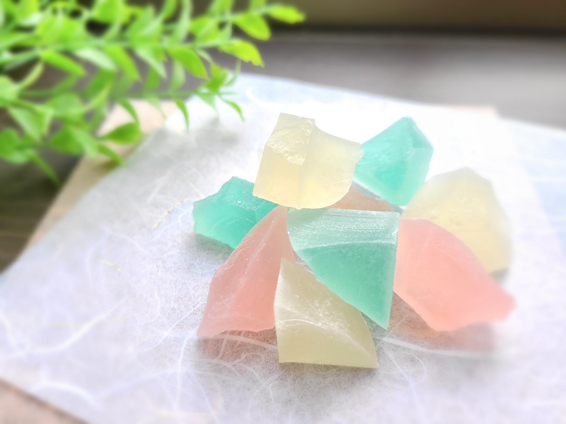 琥珀糖(こはくとう)は、寒天と砂糖から生まれた、日本の伝統的な和菓子です。